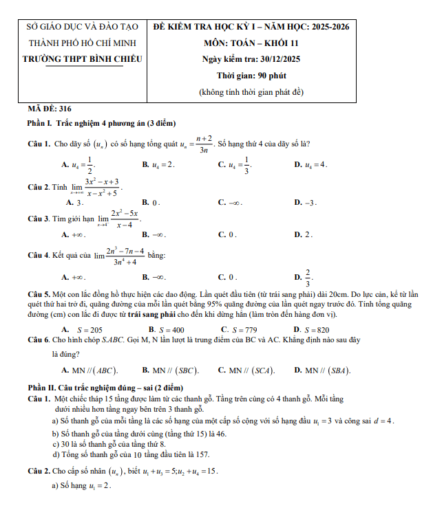 Đề học kỳ 1 Toán 11 năm 2025 – 2026 trường THPT Bình Chiểu – TP HCM