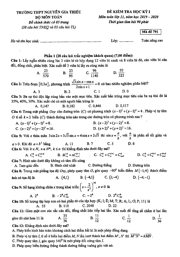 Đề kiểm tra HKI Toán 11 năm 2019 – 2020 trường Nguyễn Gia Thiều – Hà Nội