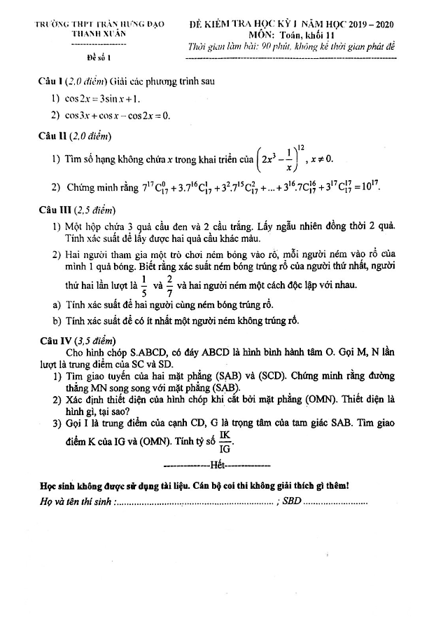Đề kiểm tra HKI Toán 11 năm 2019 – 2020 trường Trần Hưng Đạo – Hà Nội