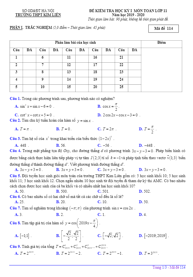 Đề kiểm tra học kỳ 1 Toán 11 năm 2019 – 2020 trường THPT Kim Liên – Hà Nội