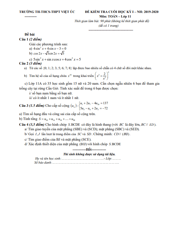 Đề thi cuối học kì 1 Toán 11 năm học 2019 – 2020 trường Việt Úc – TP HCM