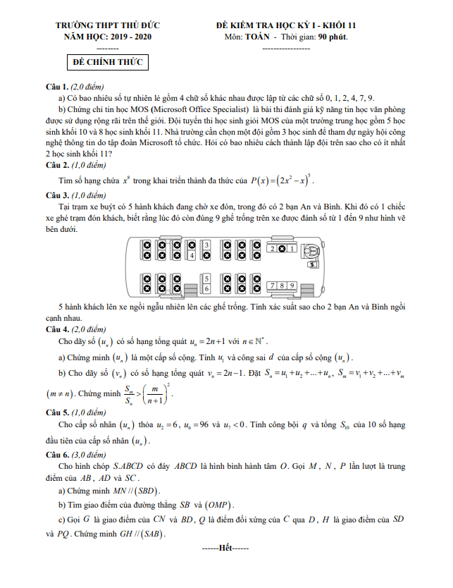 Đề kiểm tra học kì 1 Toán 11 năm 2019 – 2020 trường THPT Thủ Đức – TP HCM