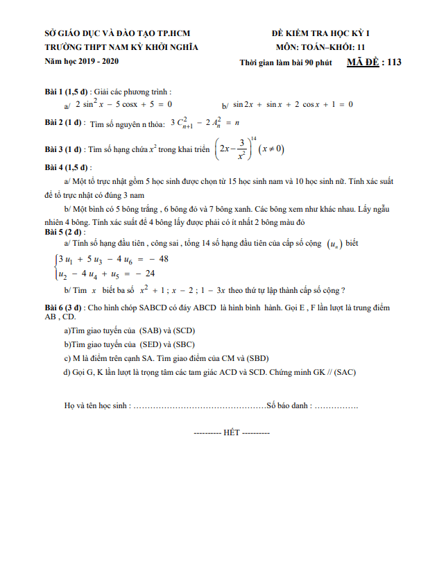 Đề kiểm tra học kỳ 1 Toán 11 năm 2019 – 2020 trường THPT Nam Kỳ Khởi Nghĩa – TP HCM