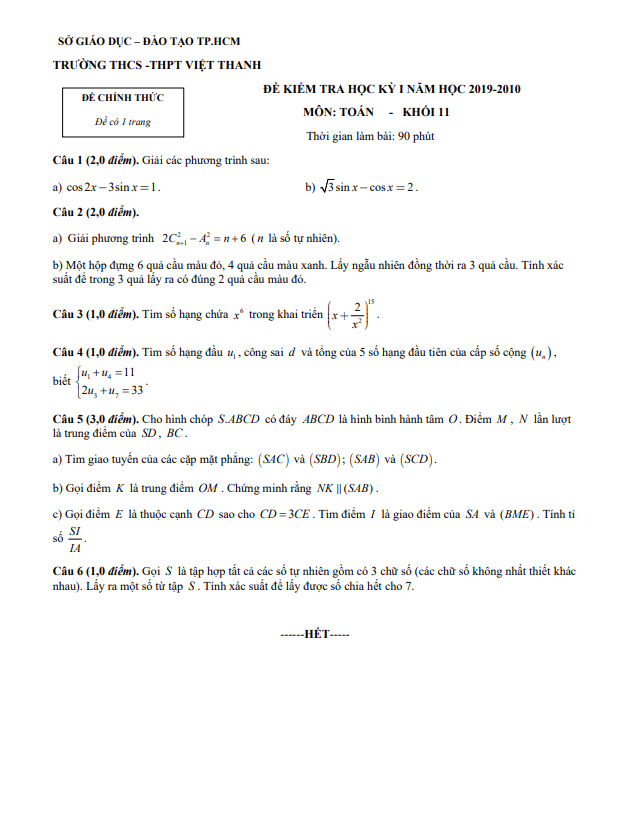 Đề kiểm tra học kỳ 1 Toán 11 năm 2019 – 2020 trường Việt Thanh – TP HCM