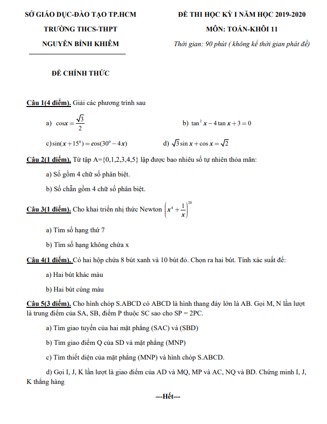 Đề thi HKI Toán 11 năm 2019 – 2020 trường Nguyễn Bỉnh Khiêm – TP HCM
