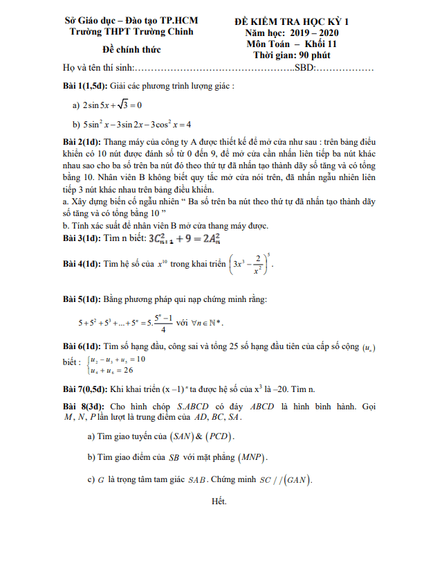 Đề thi học kỳ 1 Toán 11 năm 2019 – 2020 trường THPT Trường Chinh – TP HCM