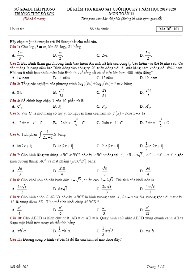Đề KSCL cuối HK1 Toán 12 năm 2019 – 2020 trường THPT Đồ Sơn – Hải Phòng