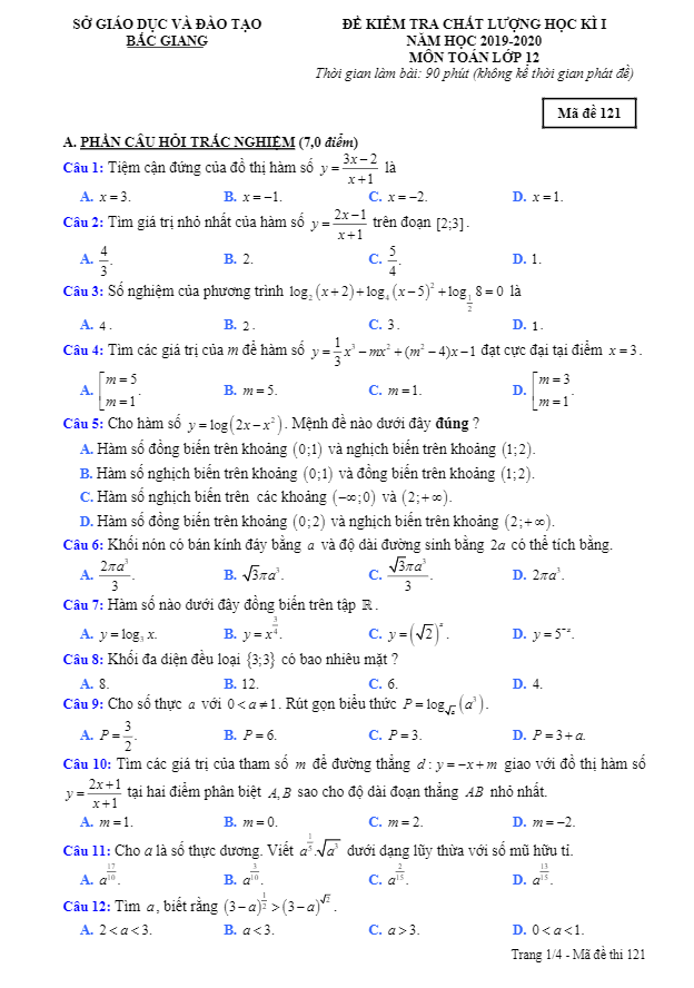 Đề thi HK1 Toán 12 năm học 2019 – 2020 sở GD&ĐT Bắc Giang