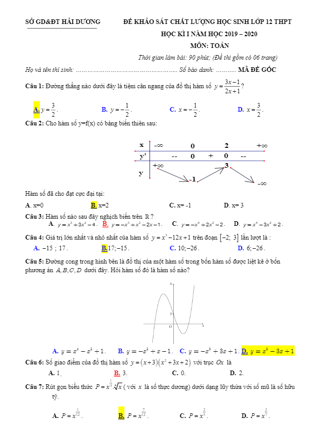Đề thi HK1 Toán 12 năm học 2019 – 2020 sở GD&ĐT Hải Dương