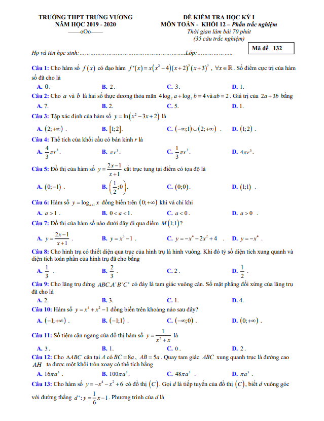 Đề kiểm tra học kỳ 1 Toán 12 năm 2019 – 2020 trường Trưng Vương – TP HCM