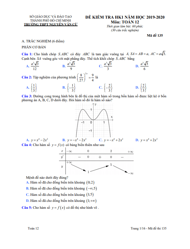 Đề thi HK1 Toán 12 năm 2019 – 2020 trường THPT Nguyễn Văn Cừ – TP HCM
