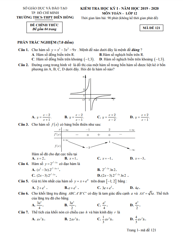 Đề thi học kì 1 Toán 12 năm 2019 – 2020 trường Diên Hồng – TP HCM