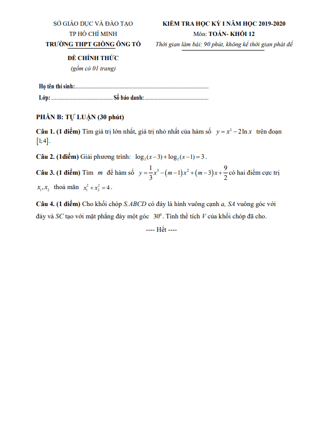 Đề thi học kì 1 Toán 12 năm 2019 – 2020 trường Giồng Ông Tố – TP HCM