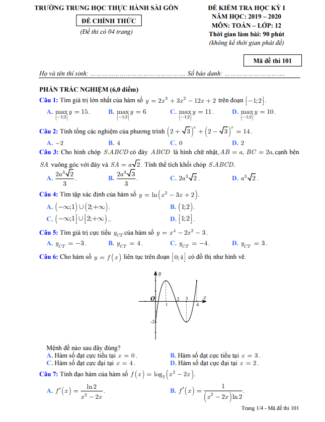 Đề thi học kì 1 Toán 12 năm 2019 – 2020 trường TH Thực hành Sài Gòn – TP HCM