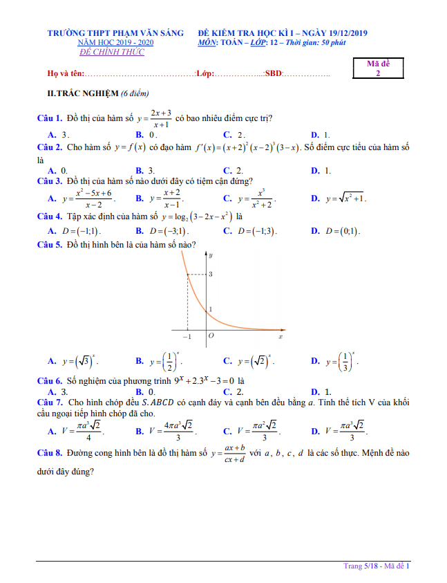 Đề thi học kì 1 Toán 12 năm 2019 – 2020 trường THPT Phạm Văn Sáng – TP HCM