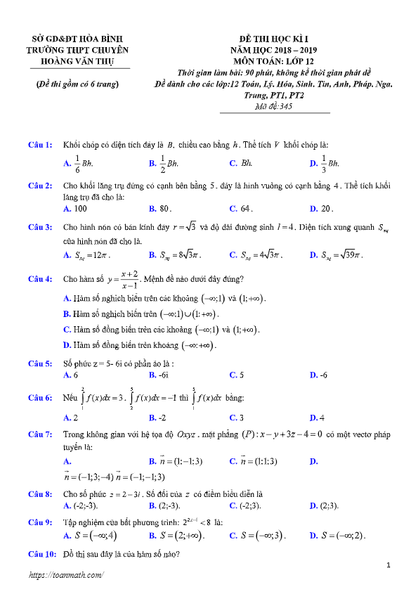 Đề thi HK1 Toán 12 năm 2018 – 2019 trường chuyên Hoàng Văn Thụ – Hòa Bình