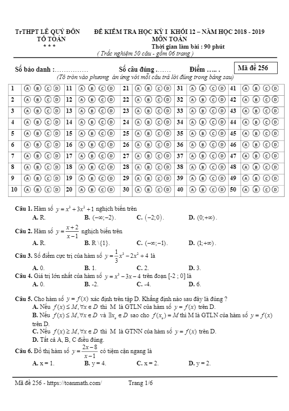 Đề thi HK1 Toán 12 năm 2018 – 2019 trường THPT Lê Quý Đôn – Quảng Ngãi