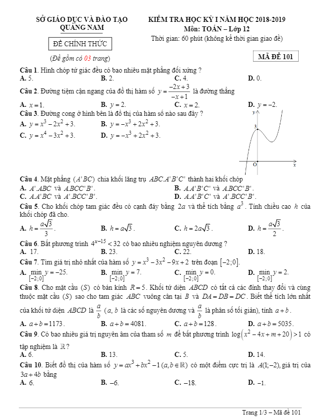 Đề thi HK1 Toán 12 năm học 2018 – 2019 sở GD và ĐT Quảng Nam