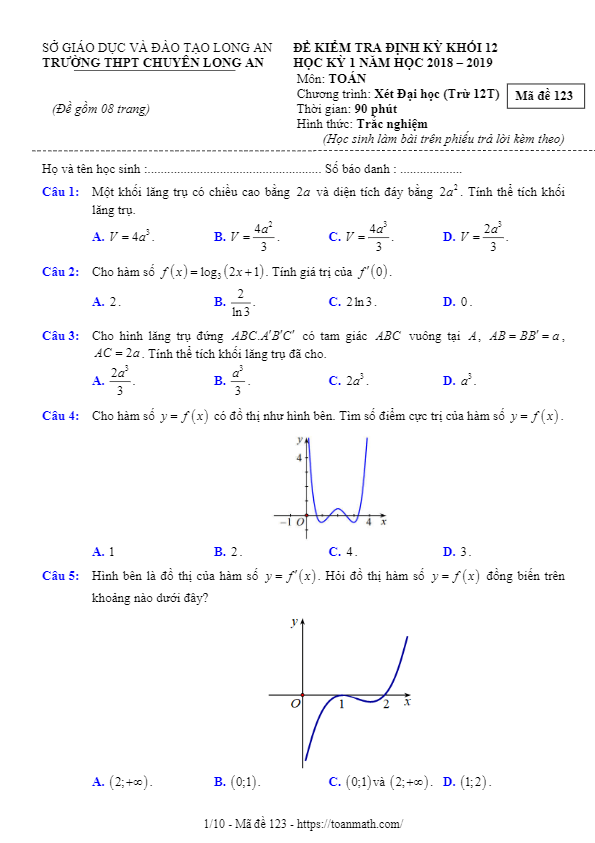 Đề thi học kỳ 1 Toán 12 năm 2018 – 2019 trường THPT chuyên Long An