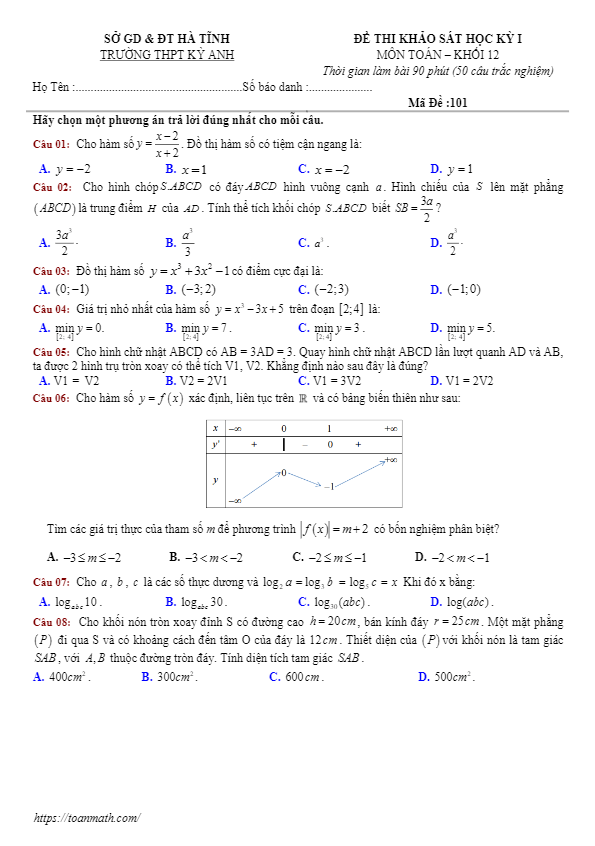 Đề thi học kỳ 1 Toán 12 năm 2018 – 2019 trường THPT Kỳ Anh – Hà Tĩnh