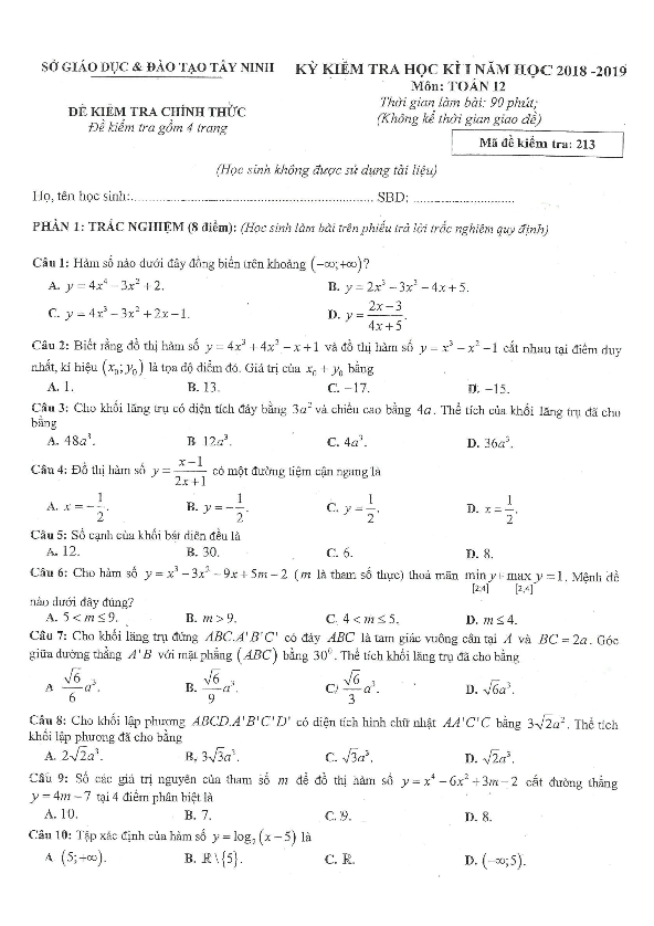 Đề thi học kỳ 1 Toán 12 năm học 2018 – 2019 sở GD&ĐT Tây Ninh
