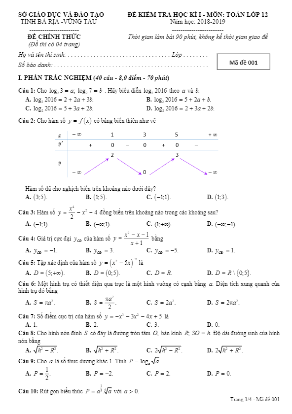 Đề thi HKI Toán 12 năm học 2018 – 2019 sở GD và ĐT Bà Rịa – Vũng Tàu