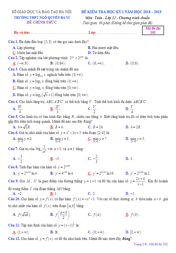 Đề thi HKI Toán 12 năm học 2018 – 2019 trường THPT Ngô Quyền – Hà Nội
