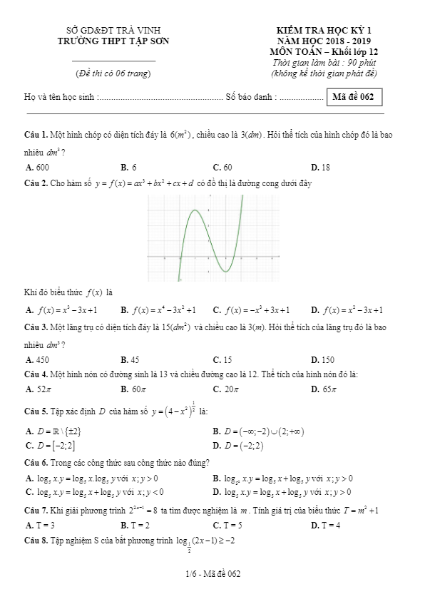 Đề thi HKI Toán 12 năm học 2018 – 2019 trường THPT Tập Sơn – Trà Vinh
