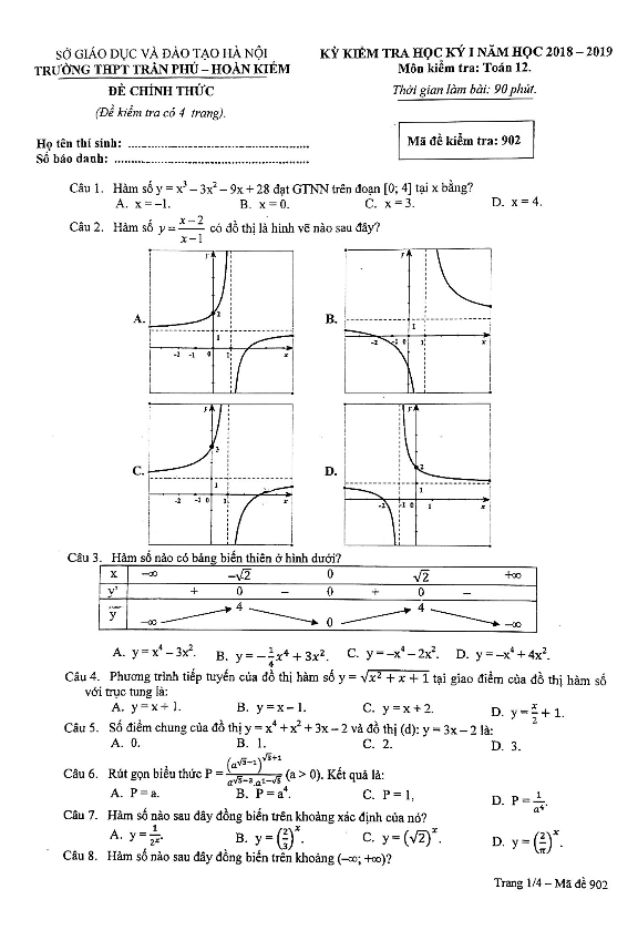 Đề thi HKI Toán 12 năm học 2018 – 2019 trường THPT Trần Phú – Hoàn Kiếm – Hà Nội