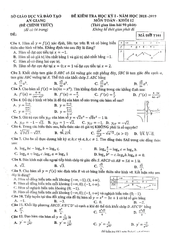 Đề thi học kỳ 1 Toán 12 năm học 2018 – 2019 sở GD và ĐT An Giang