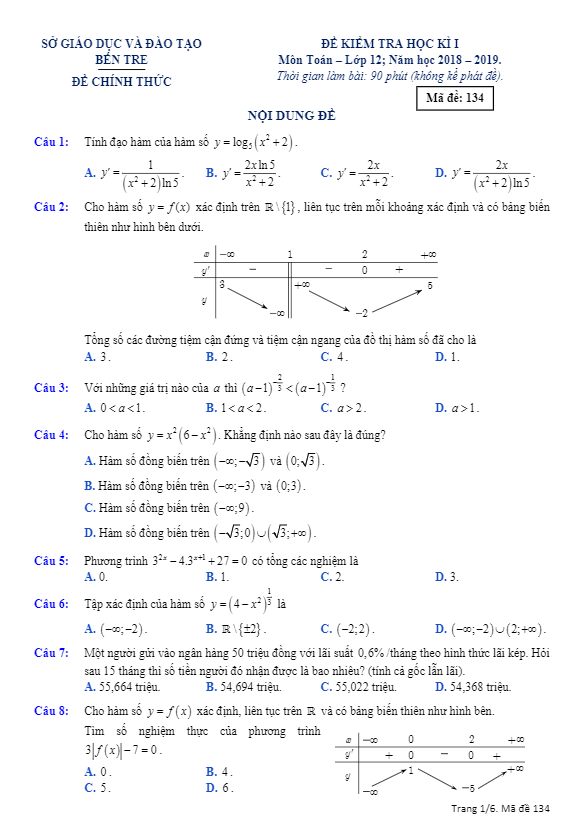 Đề thi học kỳ 1 Toán 12 năm học 2018 – 2019 sở GD và ĐT Bến Tre