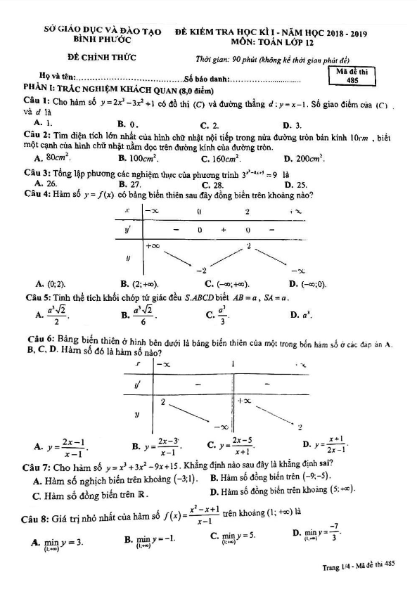 Đề thi học kỳ 1 Toán 12 năm học 2018 – 2019 sở GD và ĐT Bình Phước