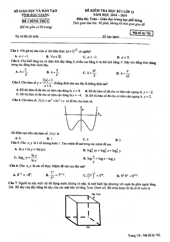 Đề thi học kỳ 1 Toán 12 năm học 2018 – 2019 sở GD và ĐT Hậu Giang