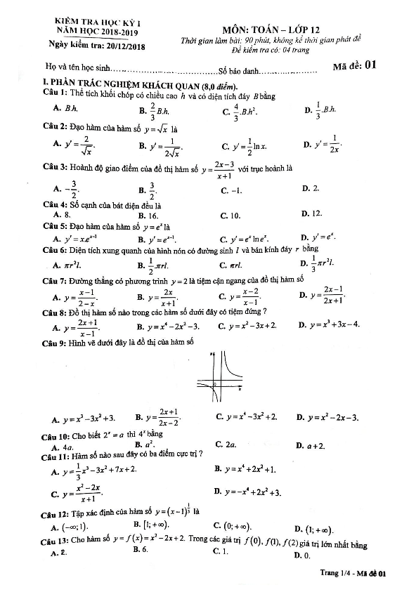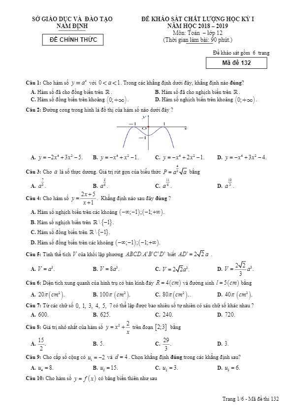 Đề thi học kỳ 1 Toán 12 năm học 2018 – 2019 sở GD và ĐT Nam Định