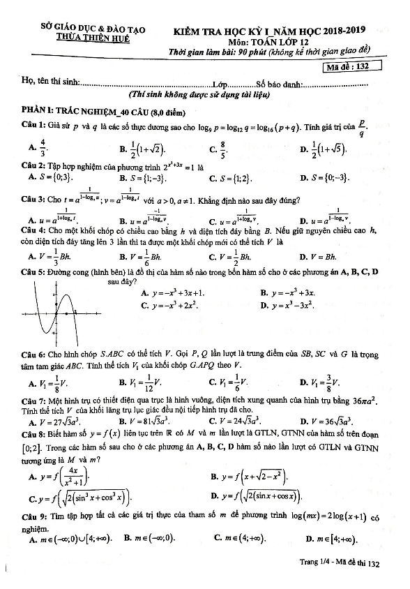 Đề thi học kỳ 1 Toán 12 năm học 2018 – 2019 sở GD và ĐT Thừa Thiên Huế