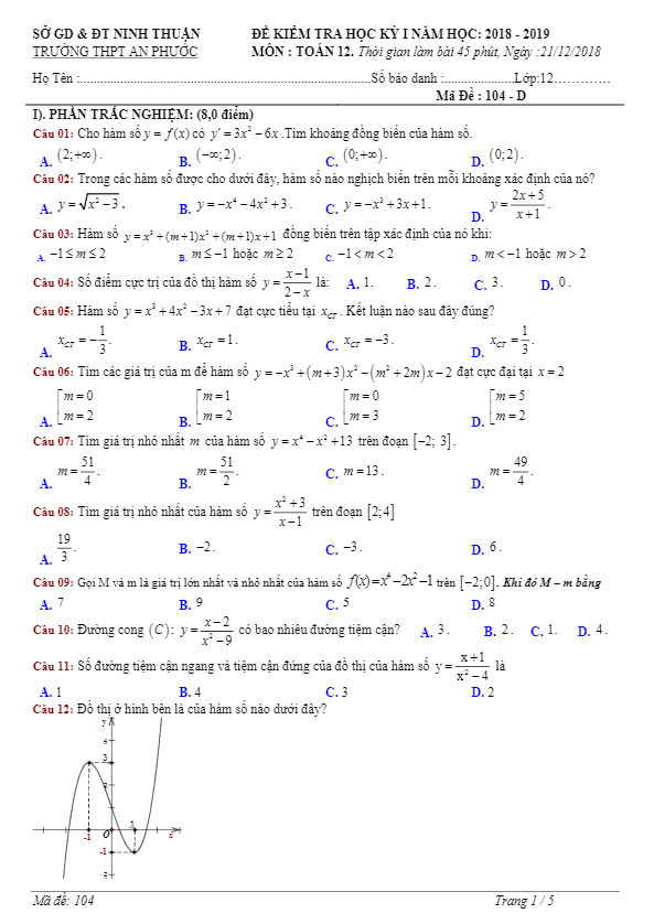 Đề thi học kỳ 1 Toán 12 năm học 2018 – 2019 trường THPT An Phước – Ninh Thuận