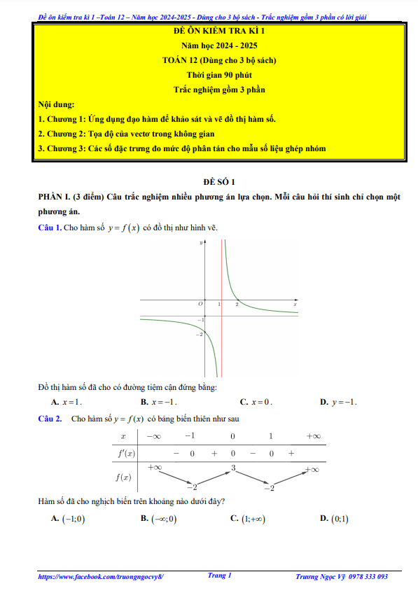 Bộ đề kiểm tra cuối học kỳ 1 môn Toán 12 năm học 2024 – 2025