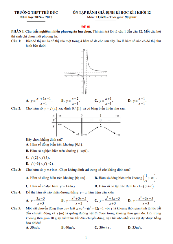 Đề ôn tập cuối kì 1 Toán 12 năm 2024 – 2025 trường THPT Thủ Đức – TP HCM