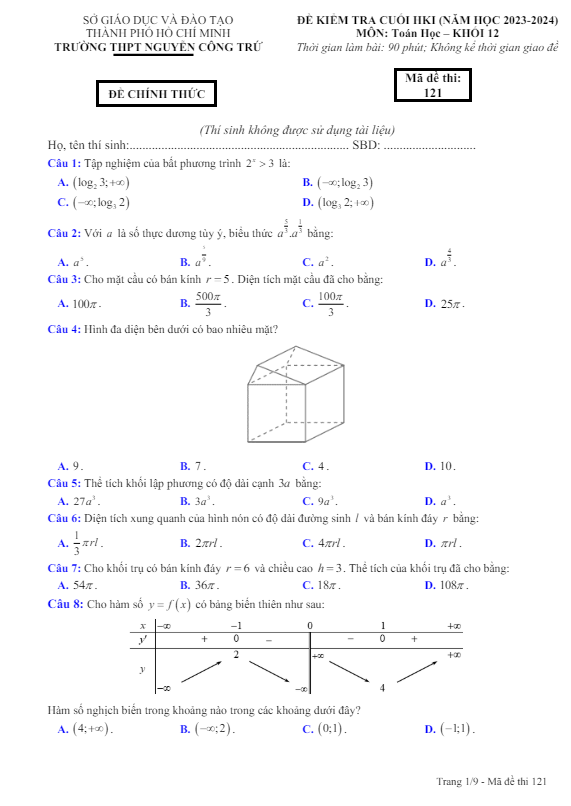 Đề cuối HK1 Toán 12 năm 2023 – 2024 trường THPT Nguyễn Công Trứ – TP HCM