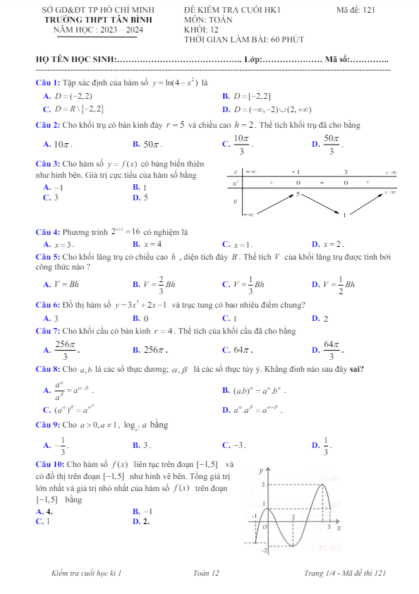 Đề cuối HK1 Toán 12 năm 2023 – 2024 trường THPT Tân Bình – TP HCM