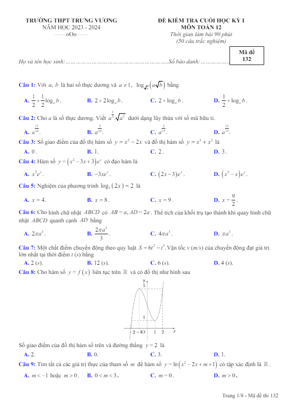 Đề cuối học kỳ 1 Toán 12 năm 2023 – 2024 trường THPT Trưng Vương – TP HCM