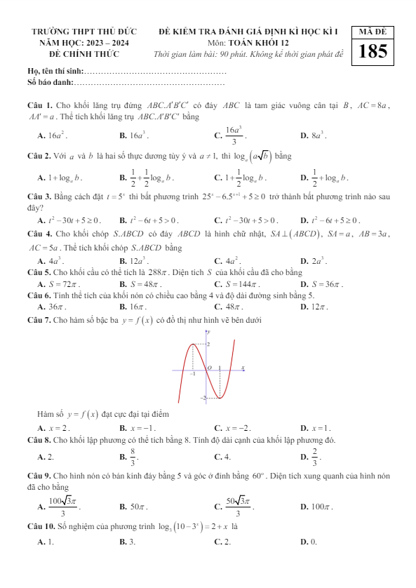 Đề học kì 1 Toán 12 năm 2023 – 2024 trường THPT Thủ Đức – TP HCM
