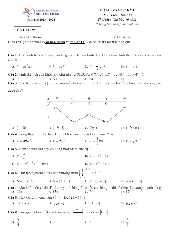 Đề học kỳ 1 Toán 12 năm 2023 – 2024 trường THPT Bùi Thị Xuân – TP HCM