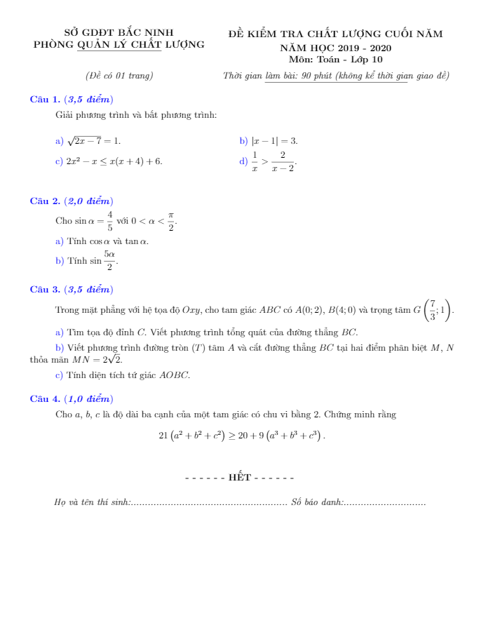Đề kiểm tra chất lượng Toán 10 cuối năm học 2019 – 2020 sở GD&ĐT Bắc Ninh