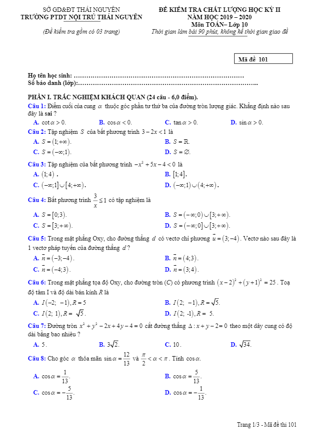 Đề kiểm tra học kỳ 2 Toán 10 năm 2019 – 2020 trường PTDT nội trú Thái Nguyên