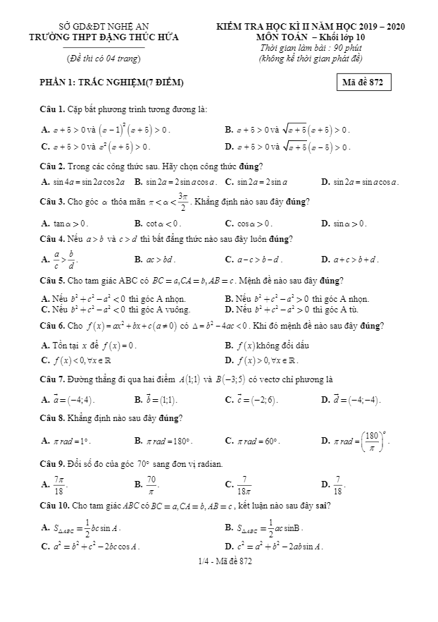 Đề thi HK2 Toán 10 năm 2019 – 2020 trường THPT Đặng Thúc Hứa – Nghệ An