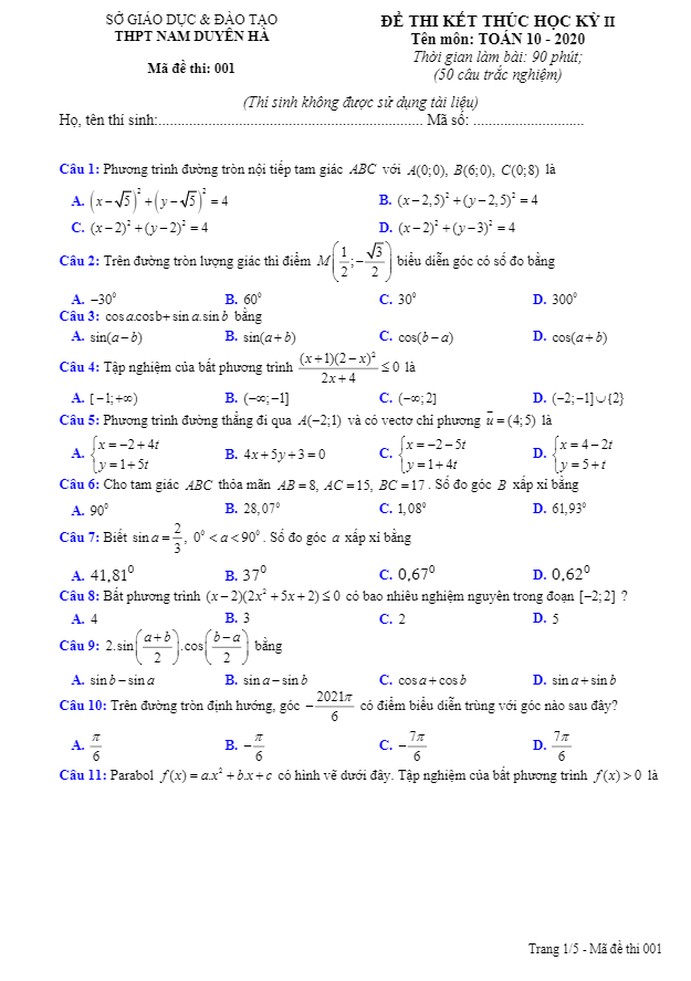 Đề thi HK2 Toán 10 năm 2019 – 2020 trường THPT Nam Duyên Hà – Thái Bình