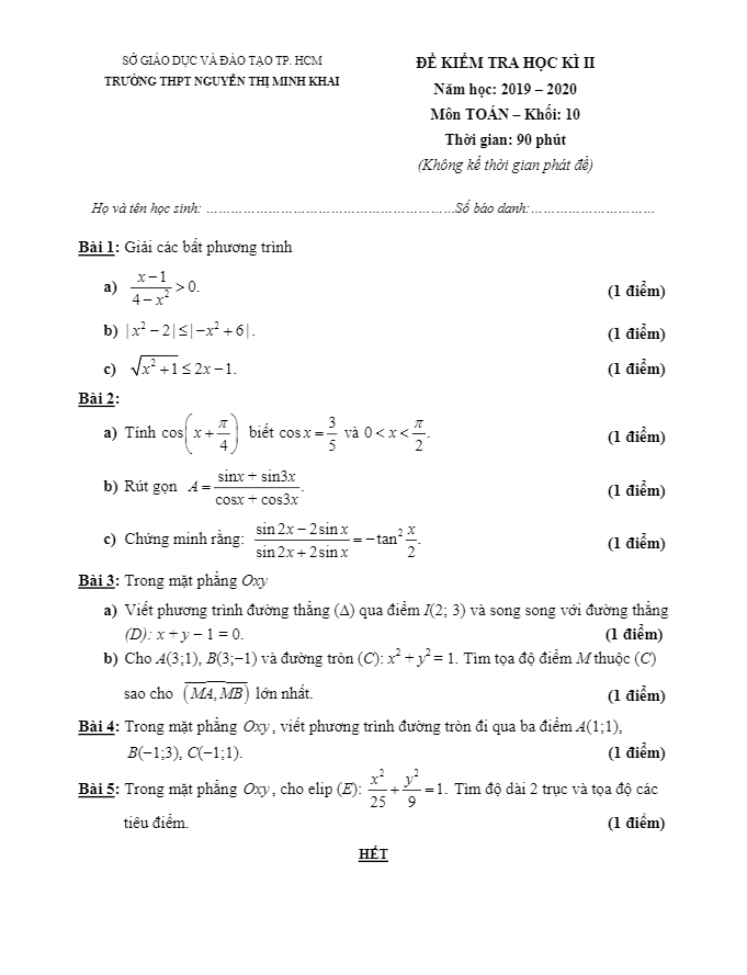 Đề thi HK2 Toán 10 năm 2019 – 2020 trường THPT Nguyễn Thị Minh Khai – TP HCM