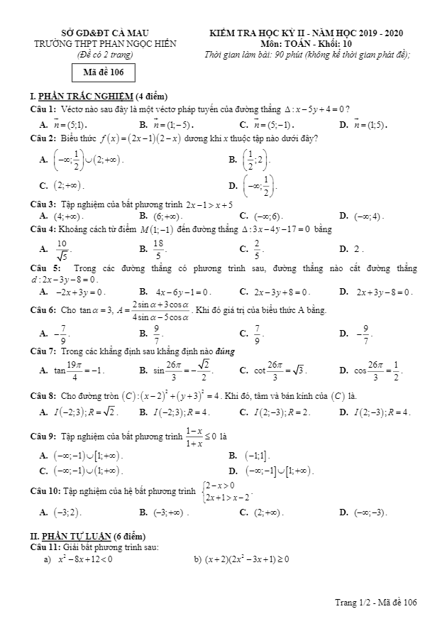 Đề thi HK2 Toán 10 năm 2019 – 2020 trường THPT Phan Ngọc Hiển – Cà Mau