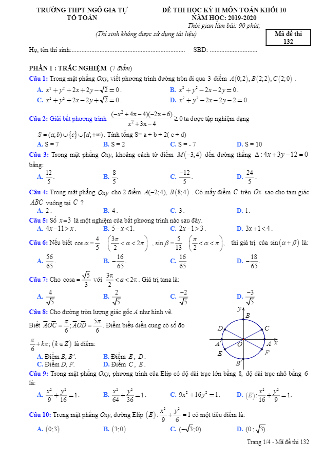 Đề thi học kì 2 Toán 10 năm 2019 – 2020 trường THPT Ngô Gia Tự – Phú Yên